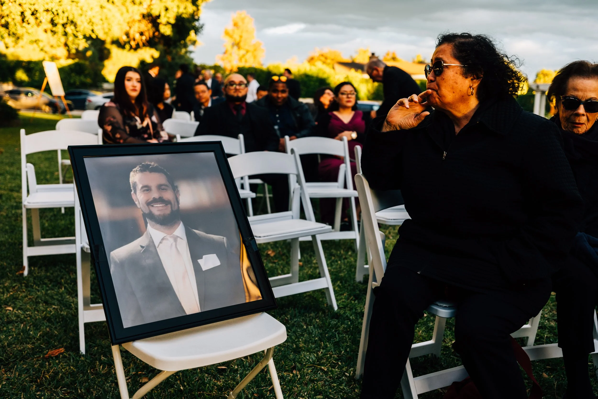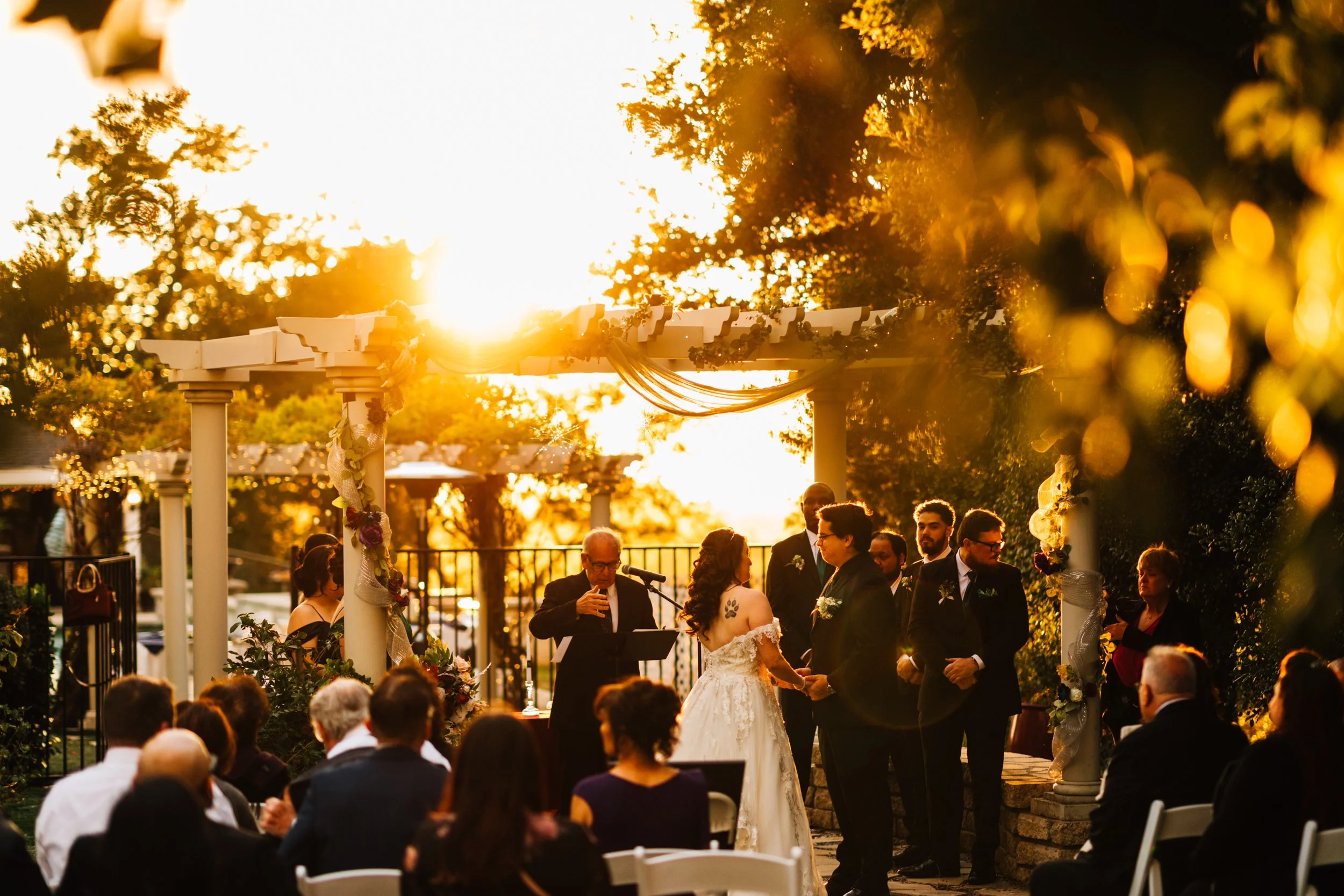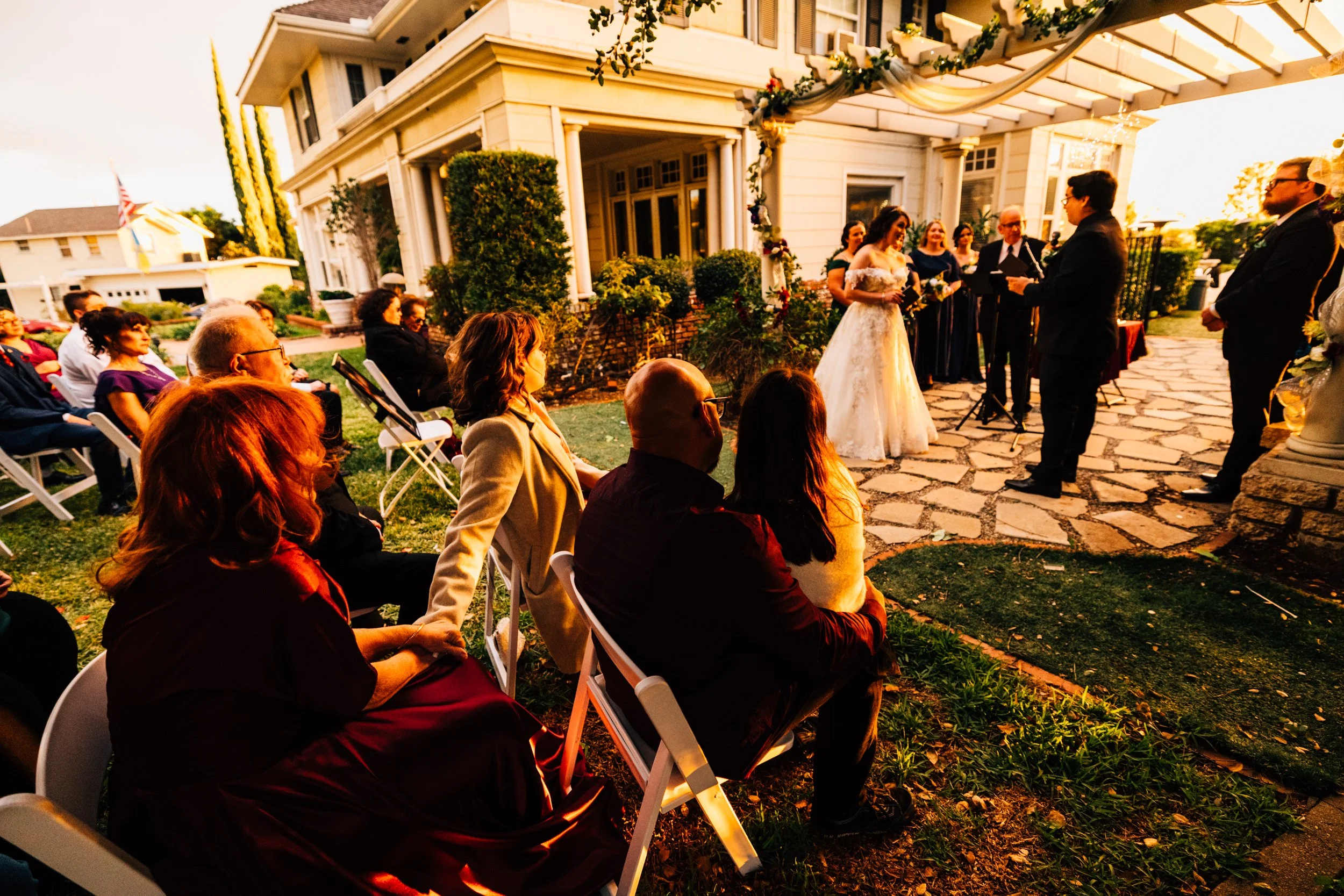 The sky threatened rain and the light was slipping away, but just as the ceremony began, the sun emerged — warm, golden, and perfect.